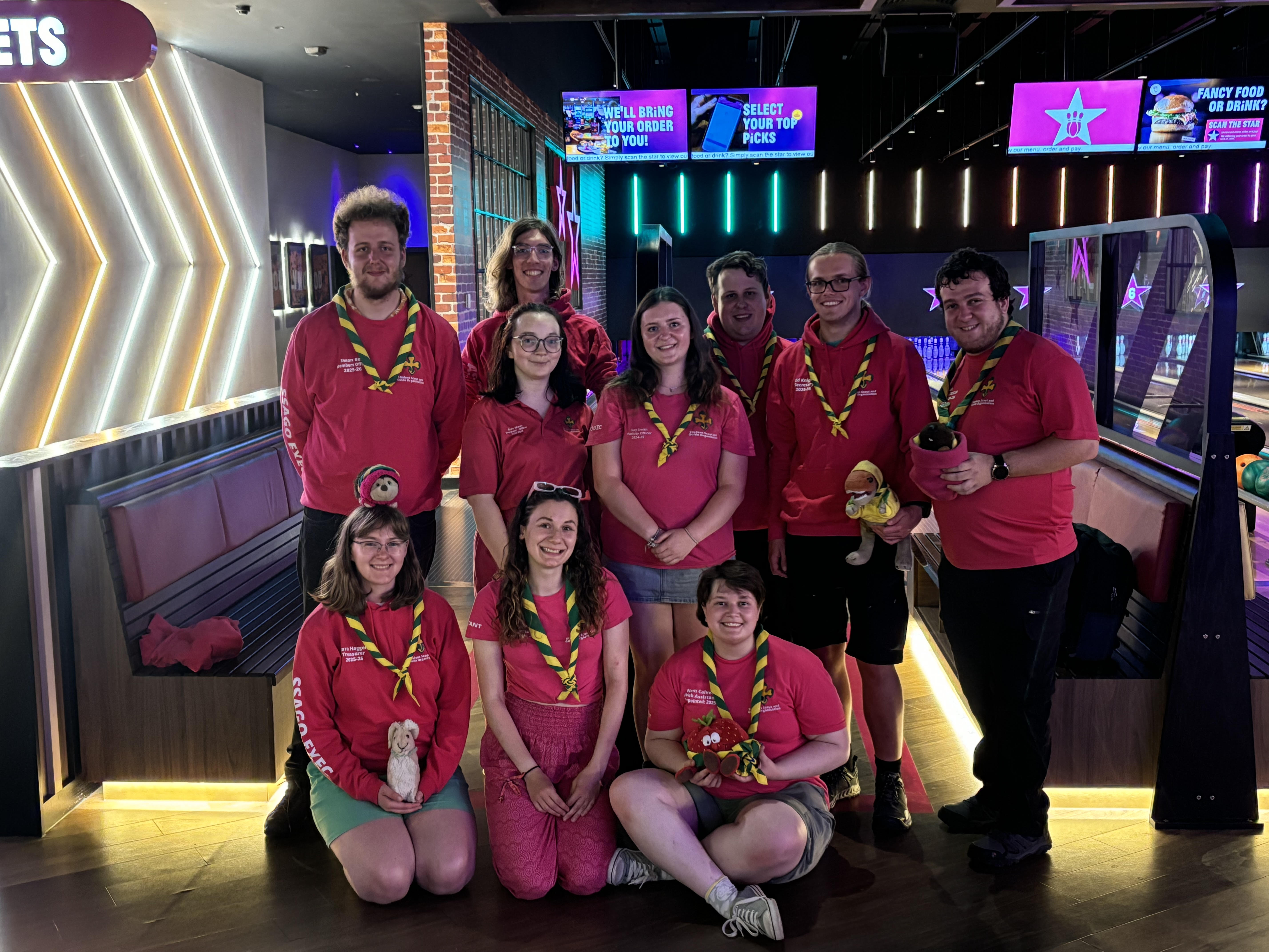 Saturday morning rolled around and we were blessed with some gorgeous weather again. After we chowed down on breakfast and suncreamed up, we began our working day. Some of the group worked on factsheets, some of the group worked on policy, some worked on publicity guides, and some of the group (or maybe just one) even managed to do their scout online training! Nem also amazingly counted and organised all the stock in the SSAGO shop! We chugged along doing our work with some conversations in between, both SSAGO related and SSAGO adjacent things alike, because lets be real we don’t talk about a whole lot else! And finally after what felt like too many hours of policy writing, we had a lovely curry for dinner and headed to the local Hollywood bowl! We had a thrilling two games of bowling where we quickly learnt that Jack is a surprisingly skilled bowler, but Jack, Nem, and Ewan made it onto the top strikers of the day board! After our team bonding session we headed back to camp for what was on the agenda as ‘big fire’, and that it was! We had a big old campfire where we had another great chance to chat and bond, and where maybe one too many people were slightly peer pressured into a tiktok video or two…